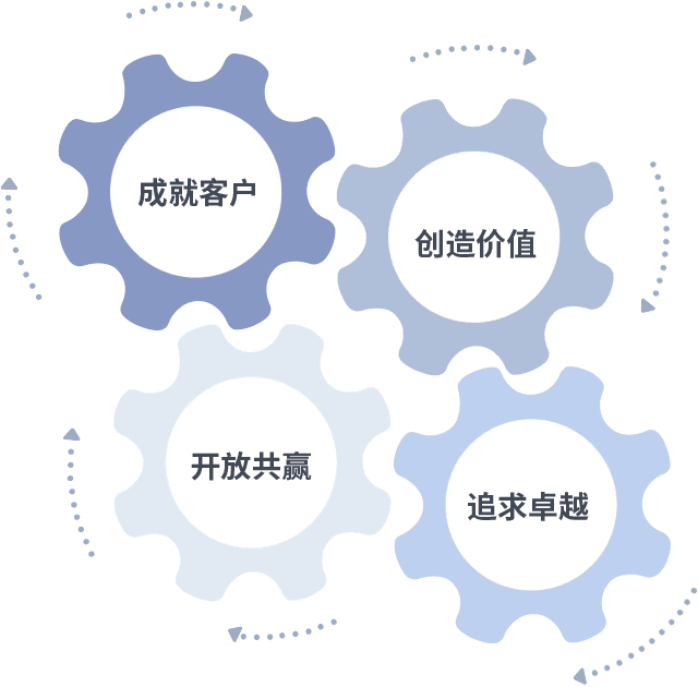 成就客户是一切决策的出发点,,,,创造价值是衡量所有工作的标准,,,追求卓越是我们做事做人的态度,,,,开放共赢是我们的格局也是最终的结果。。。价值观的齿轮环环相扣,,,,推动着组织里的每个人不断向前。。。